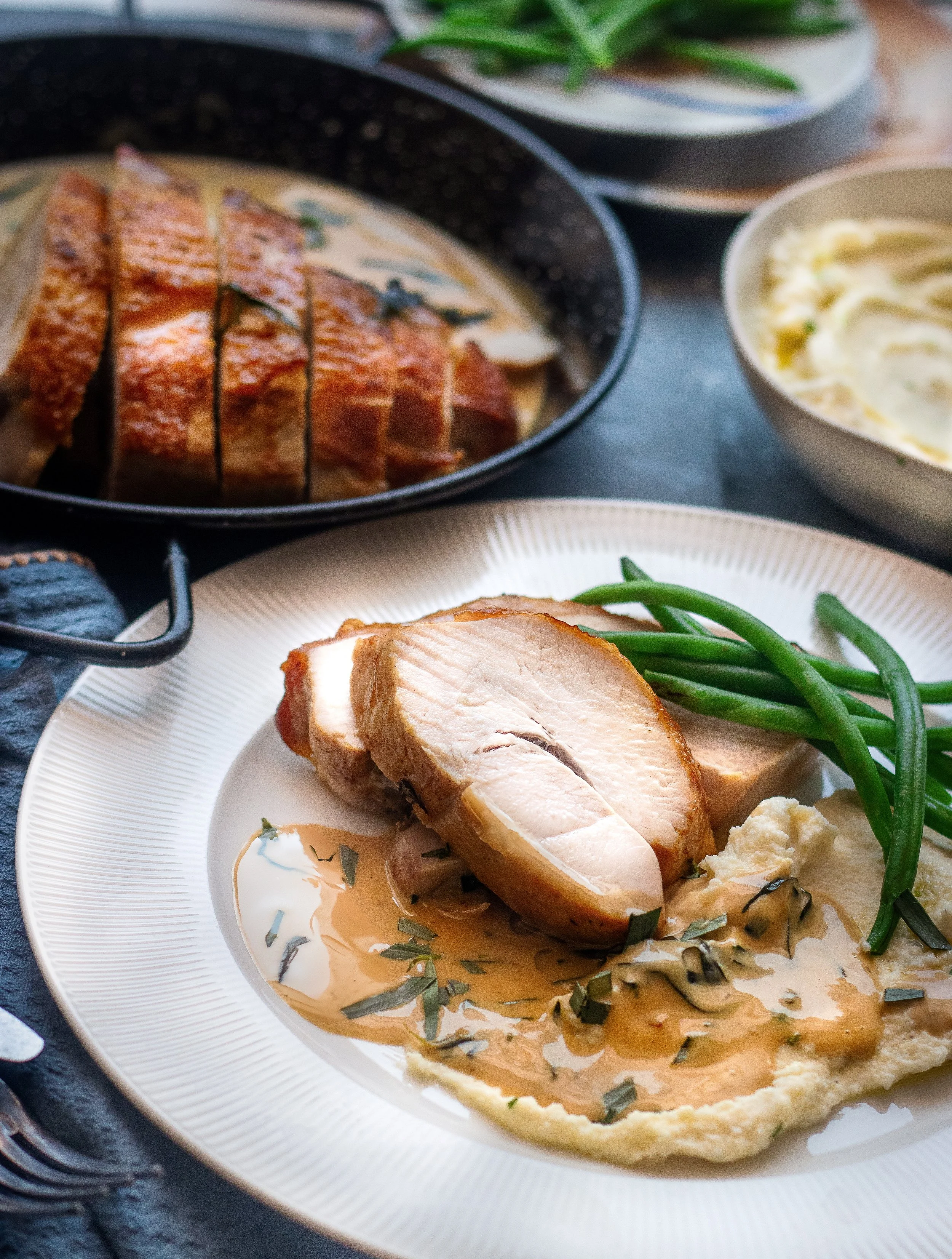 Brun kalkunbrystet med skinnsida ned til det får ei gyllen og sprø skorpe, før du snur det. Tilset smør og kvitløk før du set panna i omnen.