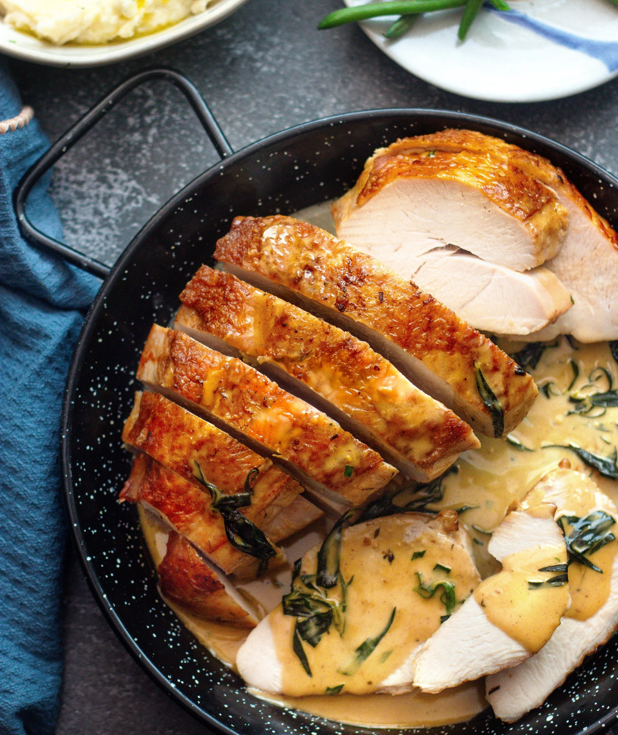 Kalkunbryst kan bli utruleg saftig når det først blir tørrsalta, får ei god steikeskorpe i panna og smør som får skumme rundt kjøtet før det går vidare i omnen.