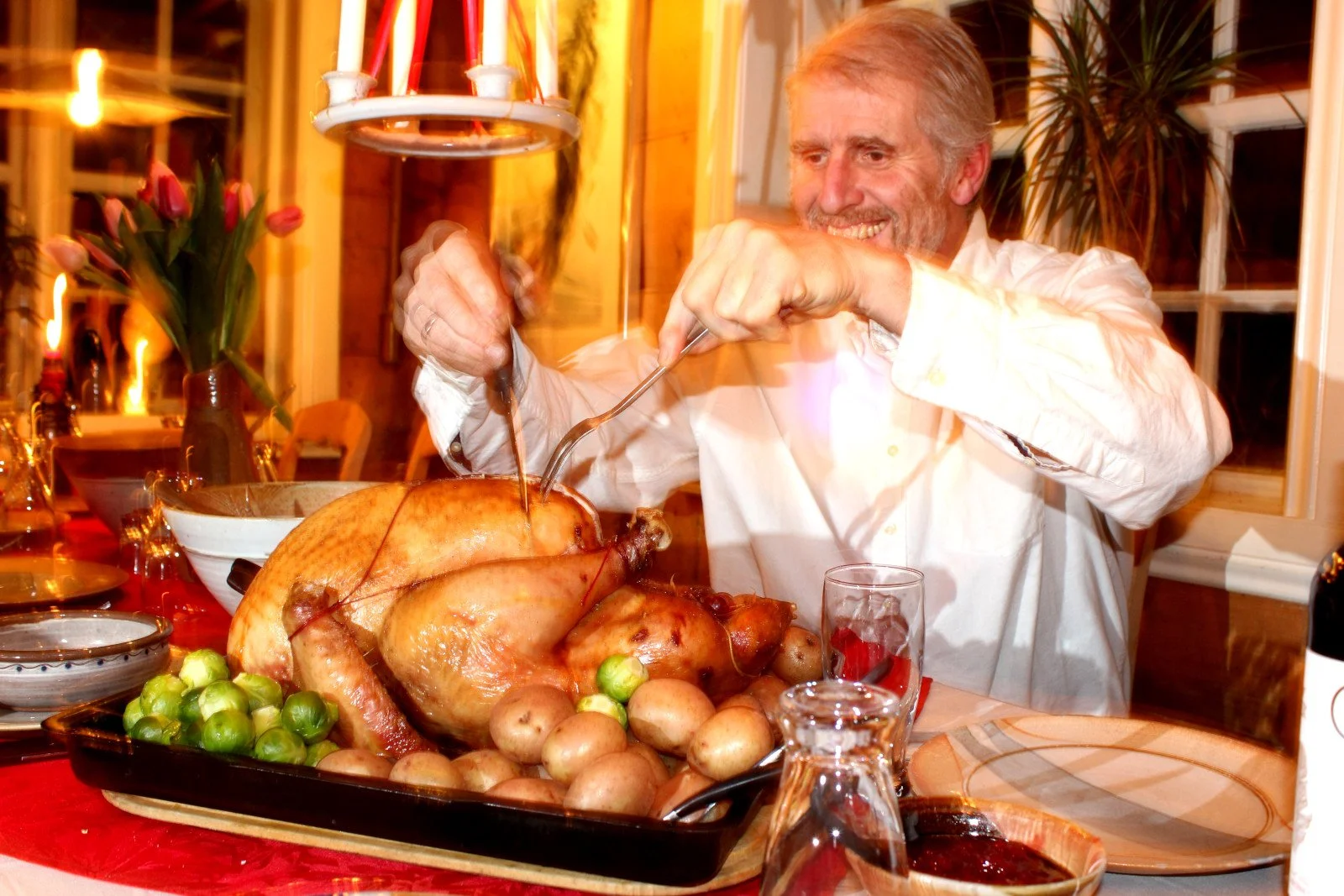 No opnar du steikeposen til kalkunbrystet og hell over steikesaften i grunnsausen (ta det litt kjapt, ikkje så nøye om alt er med og legg over aluminiumsfolie over kjøtet slik at det ikkje kjøles ned). Kjør stavmikseren i sausen som tar eventuelle klumper og kvitløkfedd. Smak til med salt.