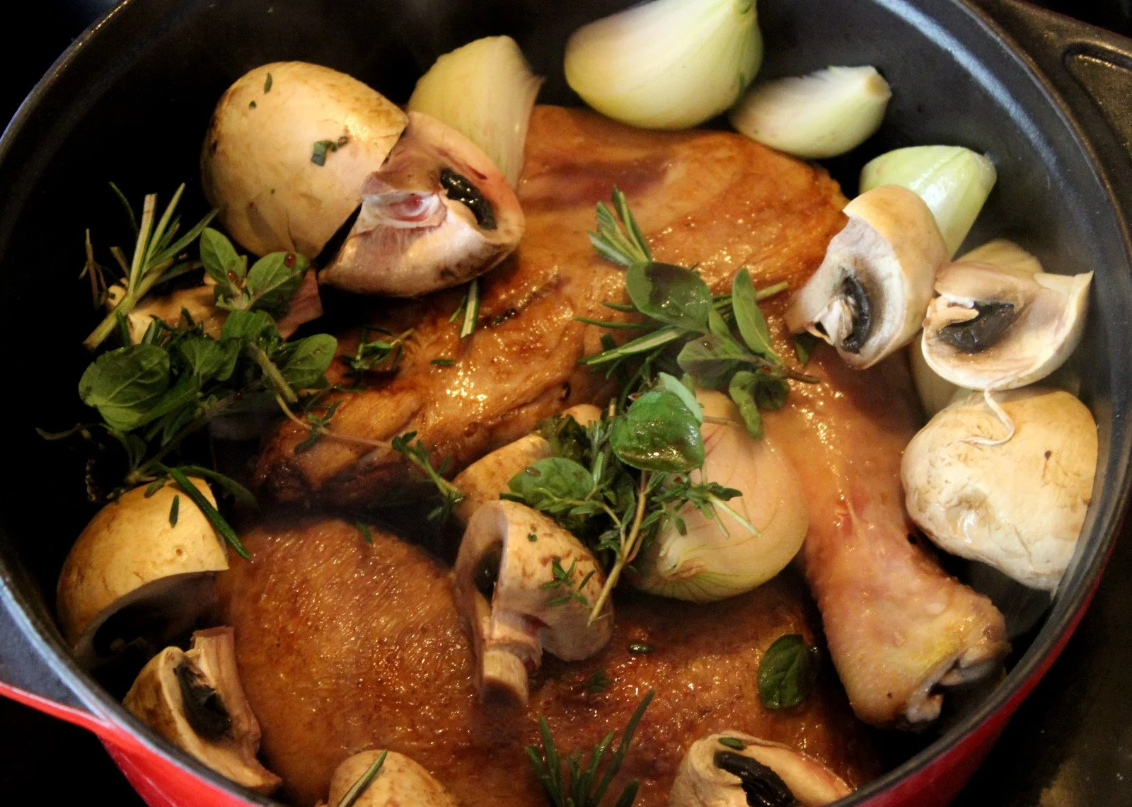 Dryss over fersk rosmarin, timian og oregano. Legg i sopp som er skoren i bitar.